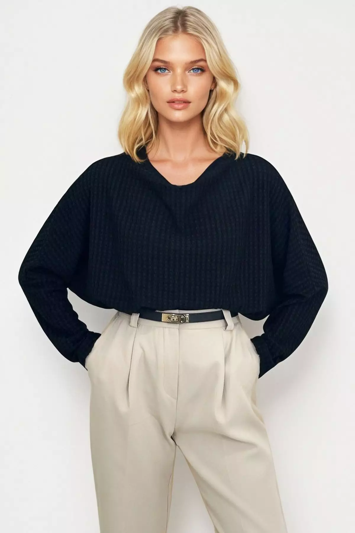 AlacatiWomen's Black Degaje Collar Wide Cut Knitted Blouse129.00