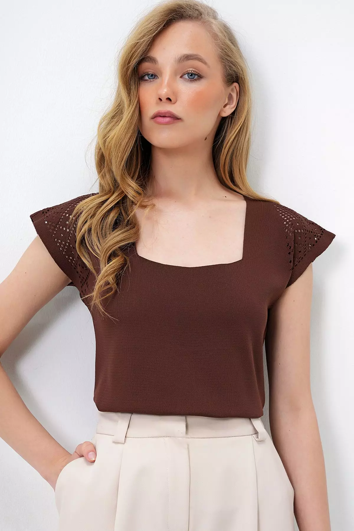 Women's Brown Square Collar Openwork Summer Knitwear Blouse