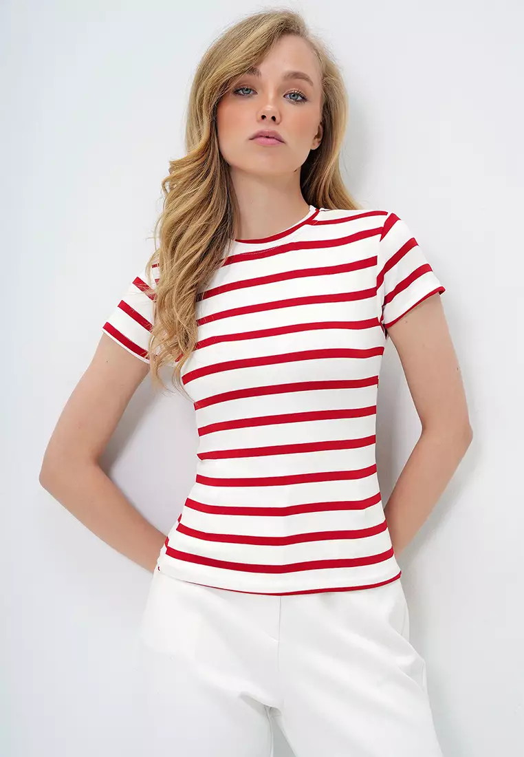 AlacatiWomen's Red Crew Neck Half Sleeve Striped Crop Blouse Alc-X13348129.00