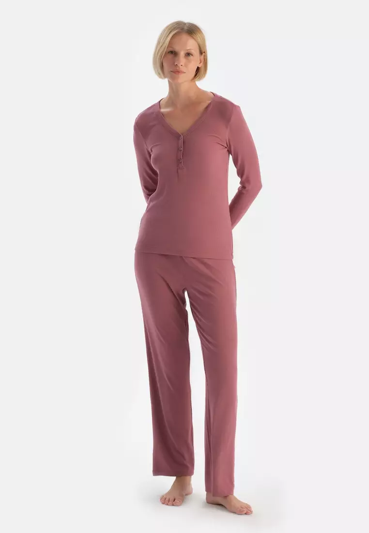 DAGİDusty Rose T-Shirt & Trousers Set, V-Neck, Regular Fit, Long Sleeve Sleepwear for Women799.00378.00