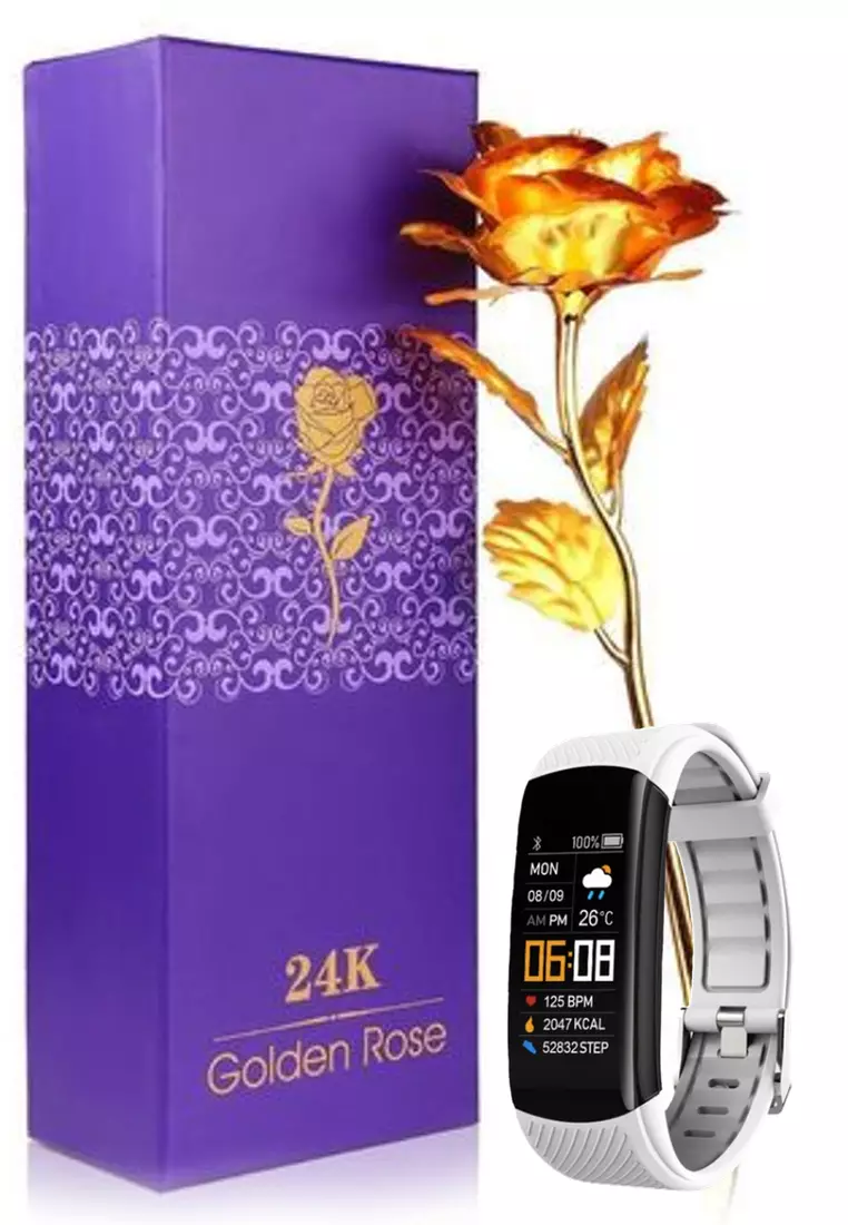 EGLANTINEGift Set - Fitness Smart Watch / MOHLIA® 24K plated Infinity Rose - Unisex IOS/Android IP Black Waterproof Fitness SmartWatch, Heart Rate Monitoring, Weather, Clock, with White Rubber Strap1298.00499.00