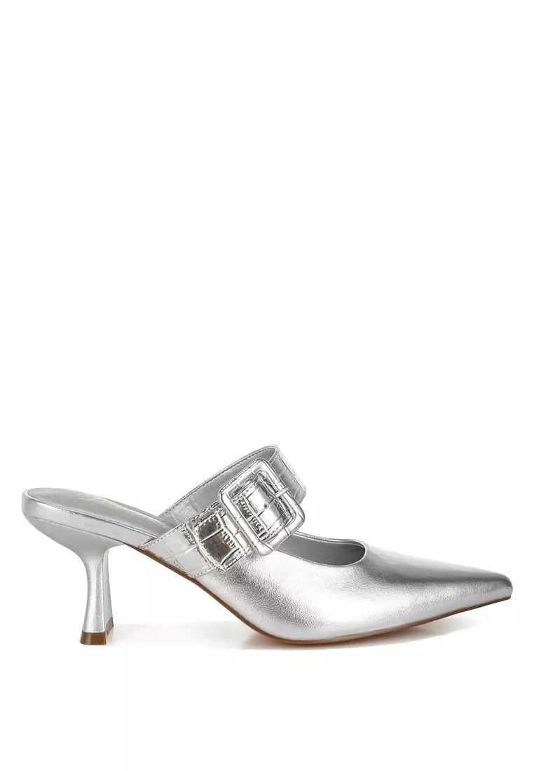 Large Buckle Kitten Heel Mules In Silver