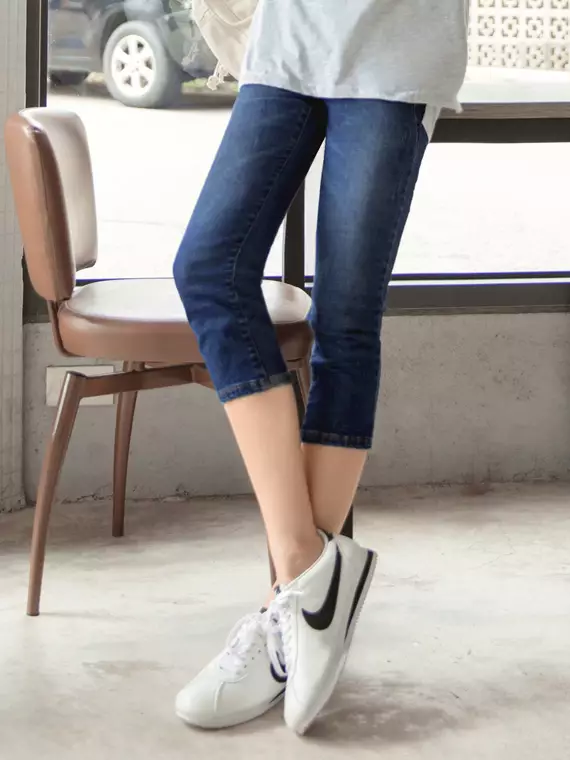 Cotton-blend ribbed elastic denim capri pants [BA4453]
