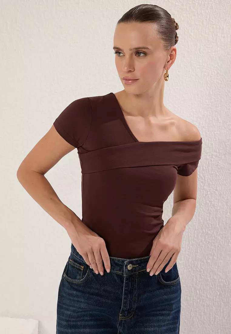 TrendyolBrown Asymmetric Collar Fitted/Body-Smoothing Knitted Blouse Twoss25Bz00381119.00