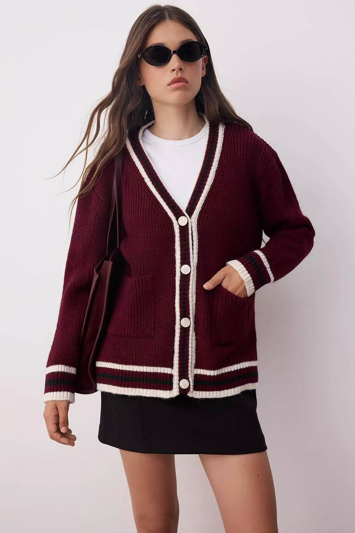 TrendyolBurgundy Color Block Wide Pattern Knitwear Cardigan409.00