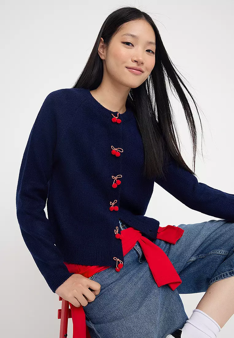 Crew Neck Cherry Accessory Detailed Knitwear Cardigan
