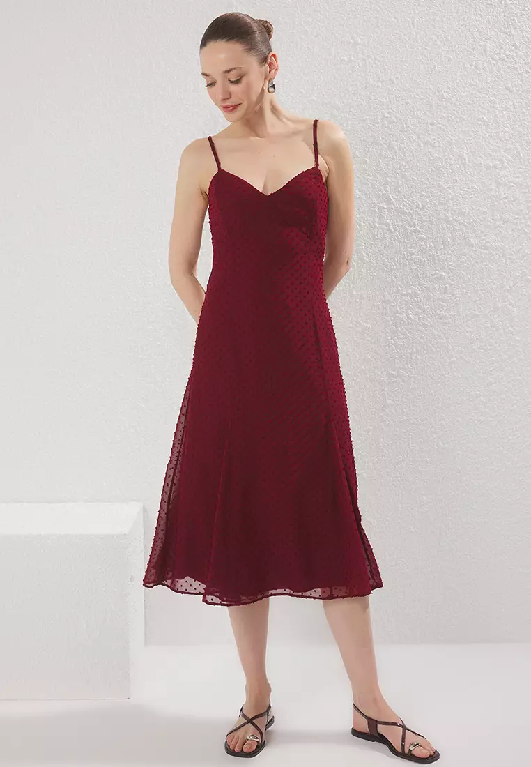 Dark Cherry Straight A Cut Fabric Featured Midi Woven Dress TWOSS25EL00558