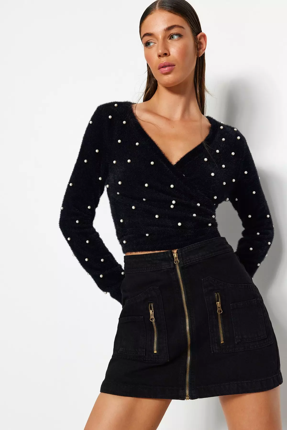 Faux Pearl Crop Wrap Knit Sweater