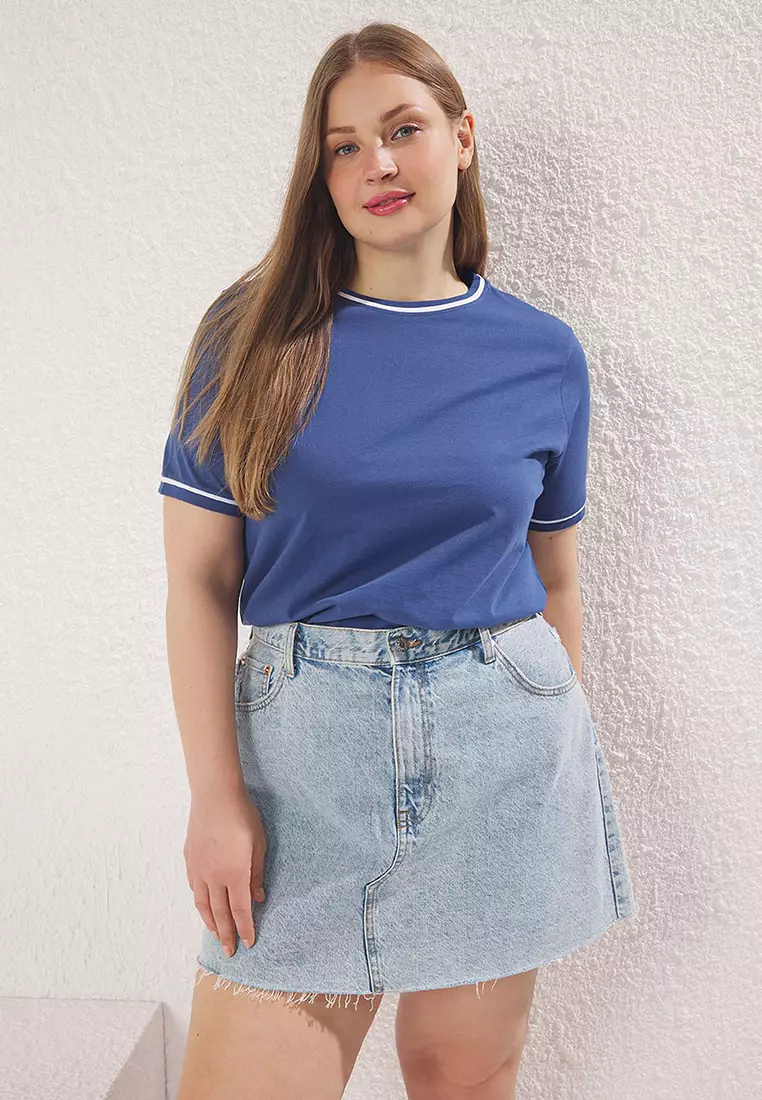 Indigo Crew Neck with Piping Detail Basic Plus Size T-shirt TBBSS25BF00050