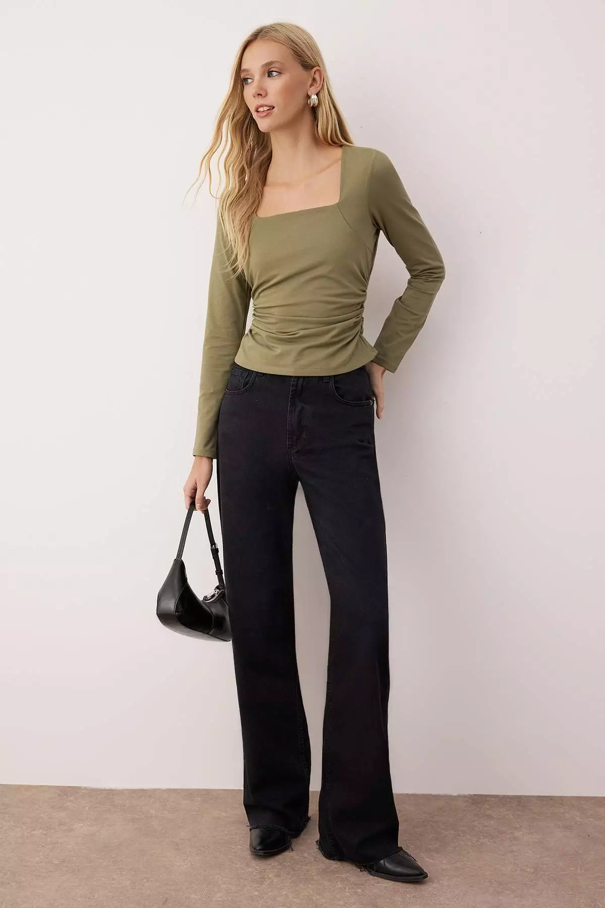 TrendyolKhaki Square Neck Gathered/Drape Detailed Slim/Fits-A-Body Knitted Blouse129.00