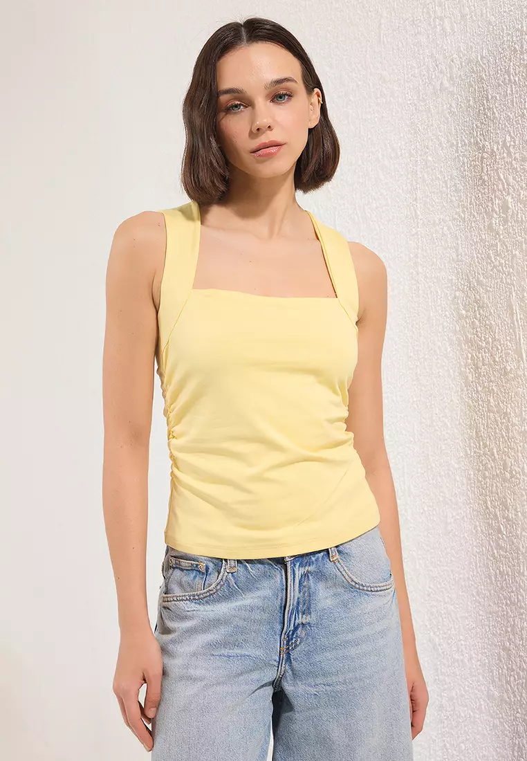 TrendyolLight Yellow Plain Square Neck Strappy Gathered Fitted/Fits Body Flexible Knitted Blouse TWOSS24BZ00400109.00