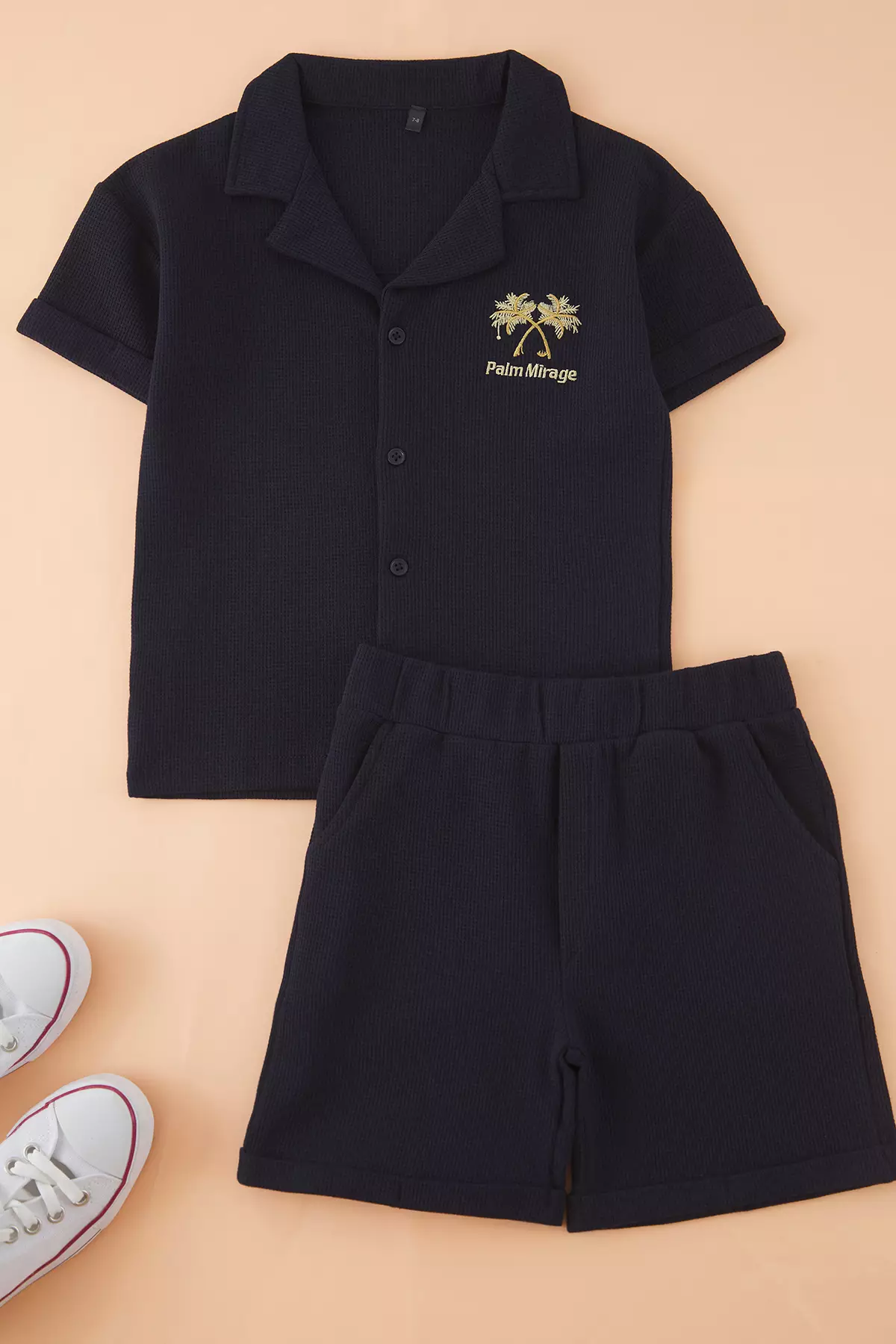 Navy Blue Boy 100% Cotton Embroidered Shirt-Shorts Textured Knitted Bottom-Top Set