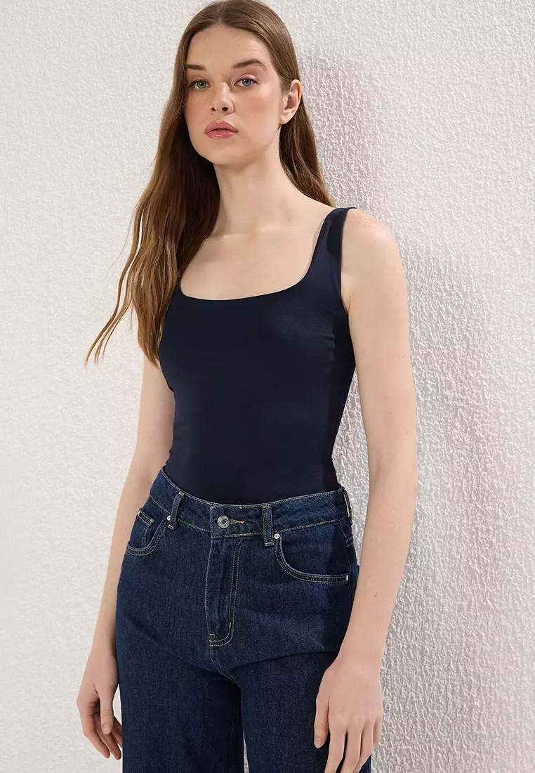 TrendyolNavy Blue Fitted/Fits on the Body with Back Detail Square Neck Snap Elastic Knitted Bodysuit TWOSS24BD00026129.00