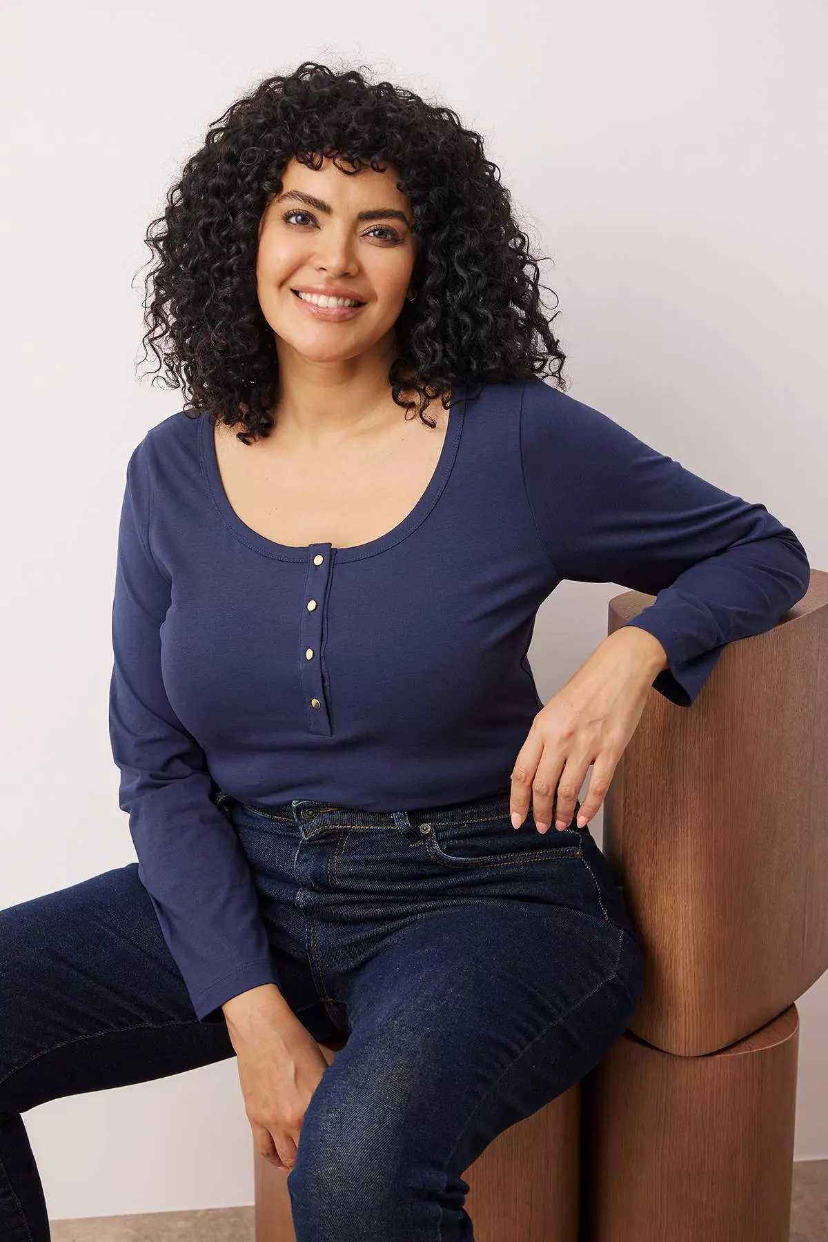 TrendyolNavy Blue Knitted Body Fitting Button Detail Plus Size Blouse Tbbaw26Af00008139.00