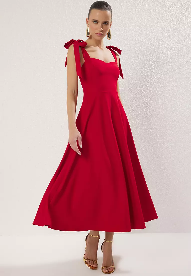 TrendyolRed A-Line Strap Detailed Woven Midi Chic Evening Prom Dress TPRSS24EL00251409.00